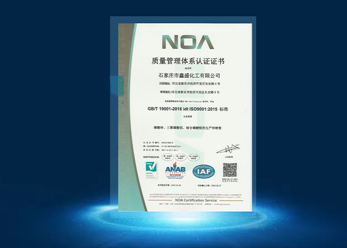 Các sản phẩm của Xinsheng Chemical được bán tốt ở Trung Quốc và nước ngoài dưới thương hiệu Meiyu. Các sản phẩm xuất khẩu của nó bao gồm chủ yếu là loạt Phosphate kẽm,Dòng Aluminium Tripolyphosphate và Dòng Aluminium Phosphate,được sử dụng rộng rãi trong sơn chống ăn mòn của đường sắt, ô tô, tàu vv. Xinsheng hóa học có công suất hàng năm là 1200 tấn zinc phosphate series,720 tấn Aluminium Tripolyphosphate seriesCác sản phẩm tuân thủ các tiêu chuẩn quốc gia, đăng ký REACH, các yêu cầu tiêu chuẩn ROHS, thử nghiệm SGs và hệ thống chứng nhận ISO9001.